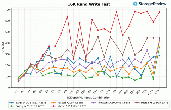 No teste de Gravação Aleatória 16K, o Micron 7600 MAX (6,4 TB) entregou desempenho consistente durante toda a varredura, variando de 17K IOPS na extremidade inferior a cerca de 350K IOPS em média, e atingindo um pico próximo a 720K IOPS em profundidades de fila mais altas. Sua estabilidade o tornou um dos desempenhos mais previsíveis, mantendo escalabilidade suave durante a execução, mesmo que não tenha atingido o topo do gráfico.